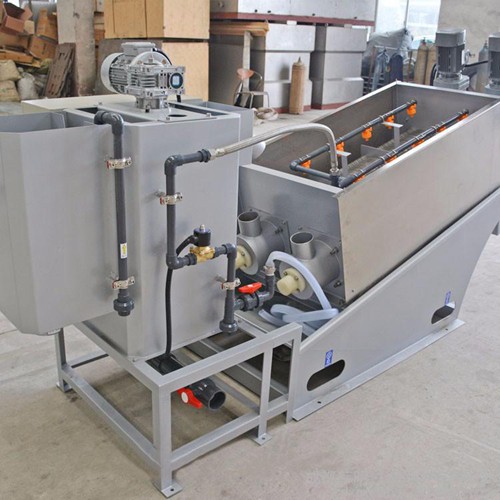 预浓缩叠螺污泥脱水机的功能是对污泥进行浓缩脱水,主要包括絮凝混合池、螺旋体和电控柜三部分。絮凝混合池内有搅拌电机,主要对计量箱流入的污泥和通过计量泵输入的絮凝剂进行混合搅拌。搅拌电机可以通过控制变频器来改变搅拌速度。